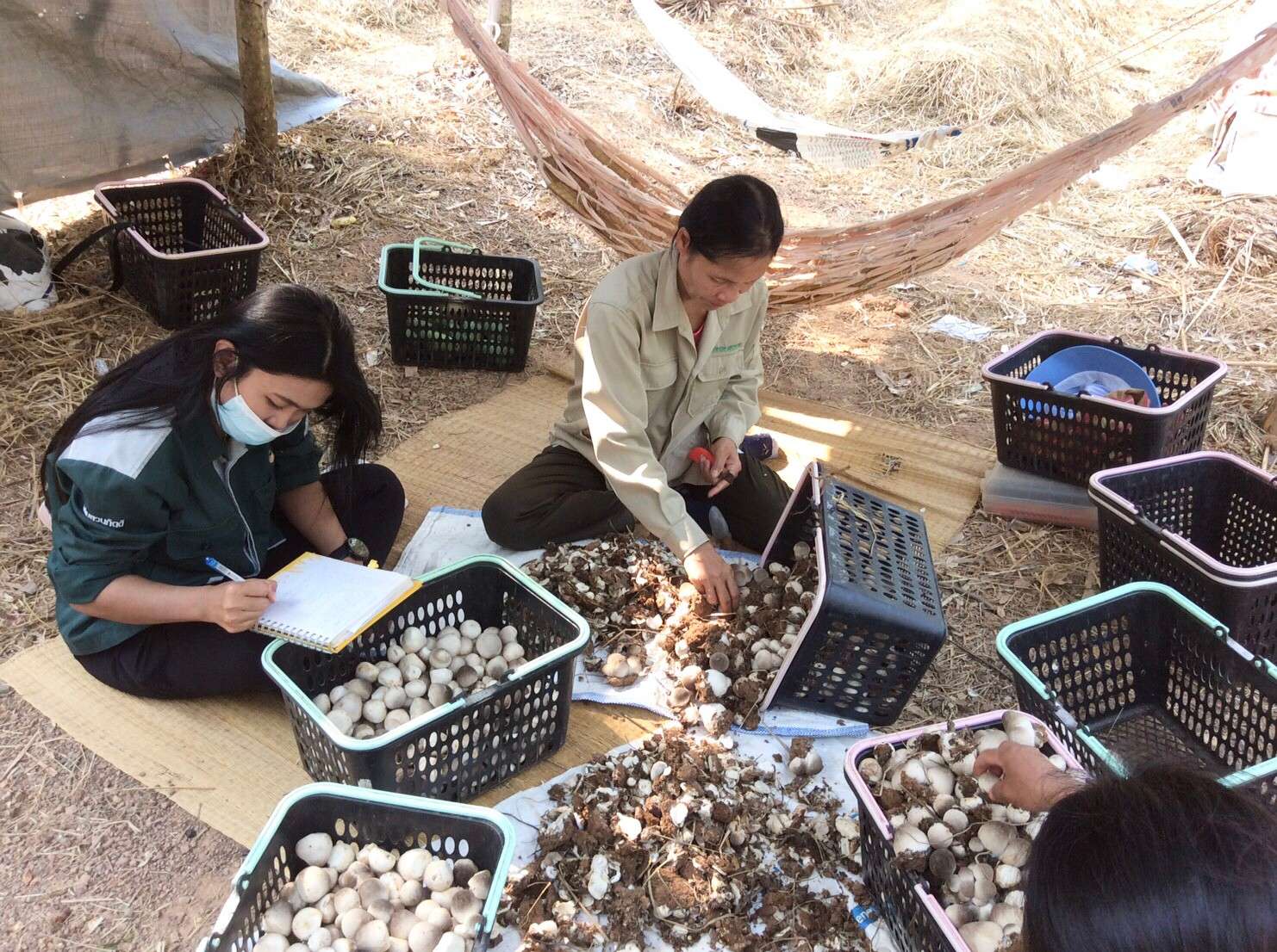 สำหรับการเพาะเห็ดฟางกองเตี้ยต้นทุนต่ำ ไม่ต้องสร้างโรงเรือน ไม่จำเป็นต้องมีพื้นที่เยอะ และเป็นการเพาะเห็ดแบบดั่งเดิมของบรรพบุรุษ เพียงแต่มาปรับให้เข้ากับพื้นที่ ง่ายๆไม่ยุ่งยาก เพียงเราทำร่องในแปลงยูคาลิปตัส นำเปลือกมันมาเหยียบใส่บล็อกให้เป็นก้อน โรยปุ๋ยเม็ด ปุ๋ยขี้วัว และเชื้อเห็ด ใช้ไม้ไผ่ ทำเป็นซี่ปักลงดิน คลุมด้วยพลาสติกใส คล้ายโดมขนาดเล็ก และใช้ฟางข้าวคลุมอีกชั้น เพื่อกันแสงแดด และ พลาสติกใสจะกันไม่ให้ความชื้อในกองเห็ดระเหย ใช้เวลาไม่เกิน 1 สัปดาห์เห็ดก็จะออกให้เราเก็บขายได้ทุกวัน มีระยะเวลาเก็บได้ 14-15 วัน ตอนนี้สมาชิกที่เริ่มเพาะเห็ดในแปลงยูคาลิปตัสมี 4 ครอบครัว ทำได้ตลอดตามแรงที่ตนเองทำไหว เฉลี่ยแล้วใน 1 วัน จะเก็บได้วันละไม่ต่ำกว่า 500 บาท สูงสุดที่เคยขายได้ถึงวันละ 6,000-7,000 บาท เฉลี่ยเดือนนึงมีรายได้ประมาณ 40,000 บาท เรียกได้ว่ารายได้ดีทีเดียวค่ะ